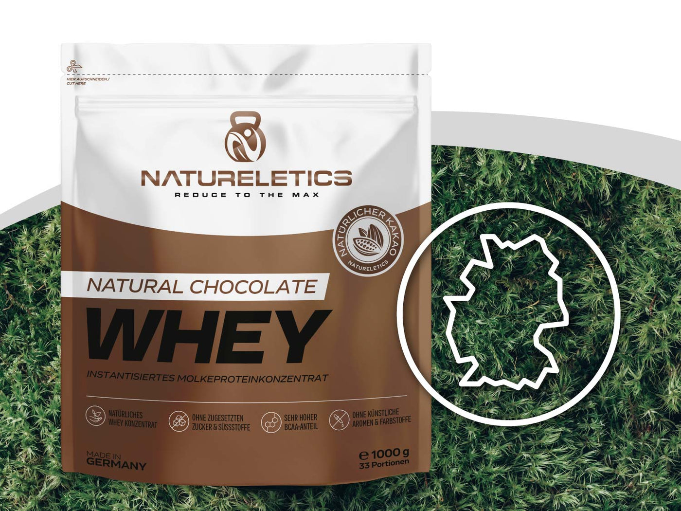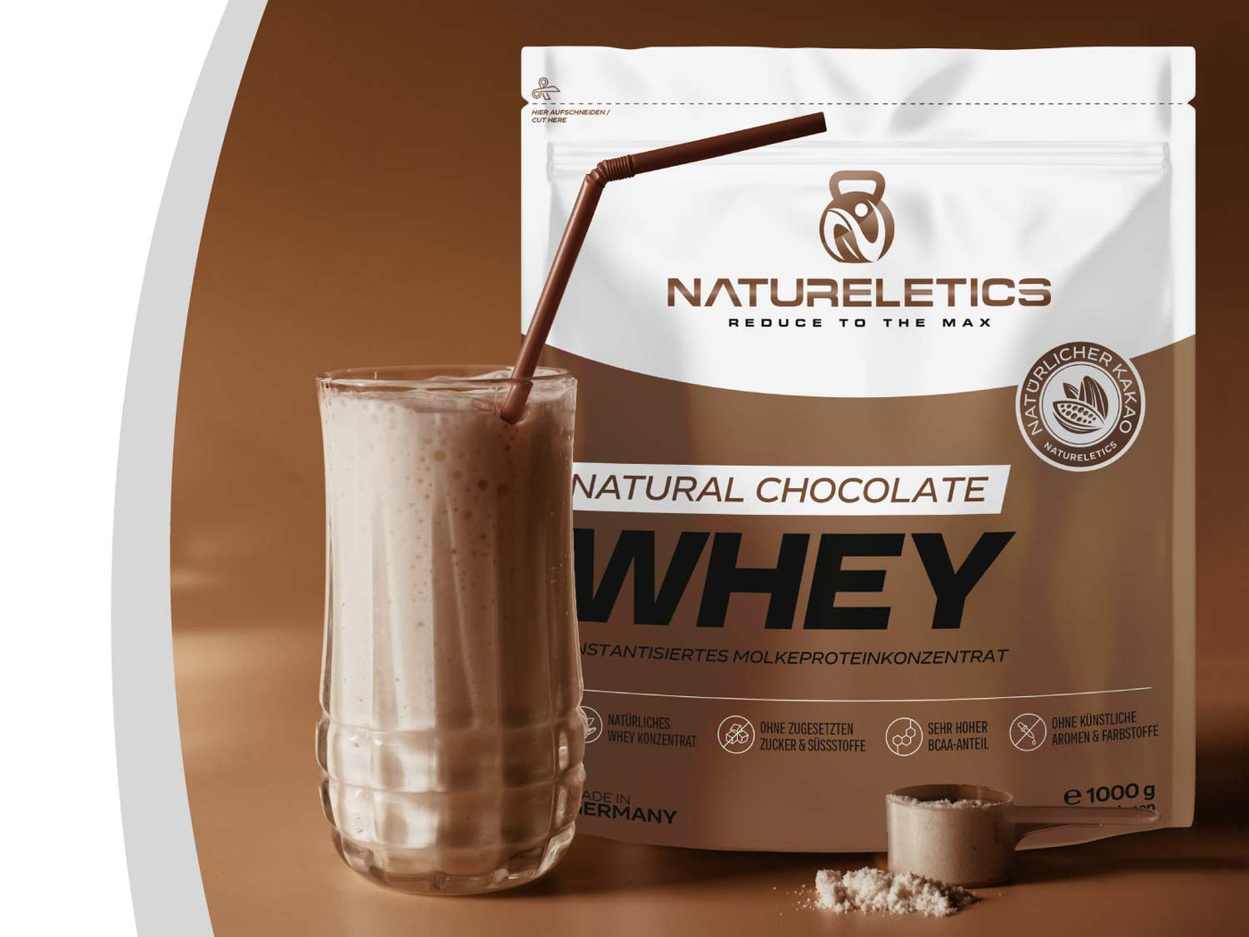 Mit unserem Natureletics PURE NATURAL WHEY CHOCOLATE erhältst Du einen gesunden und leckeren, nach dunkler Schokolade schmeckenden Eiweißshake.