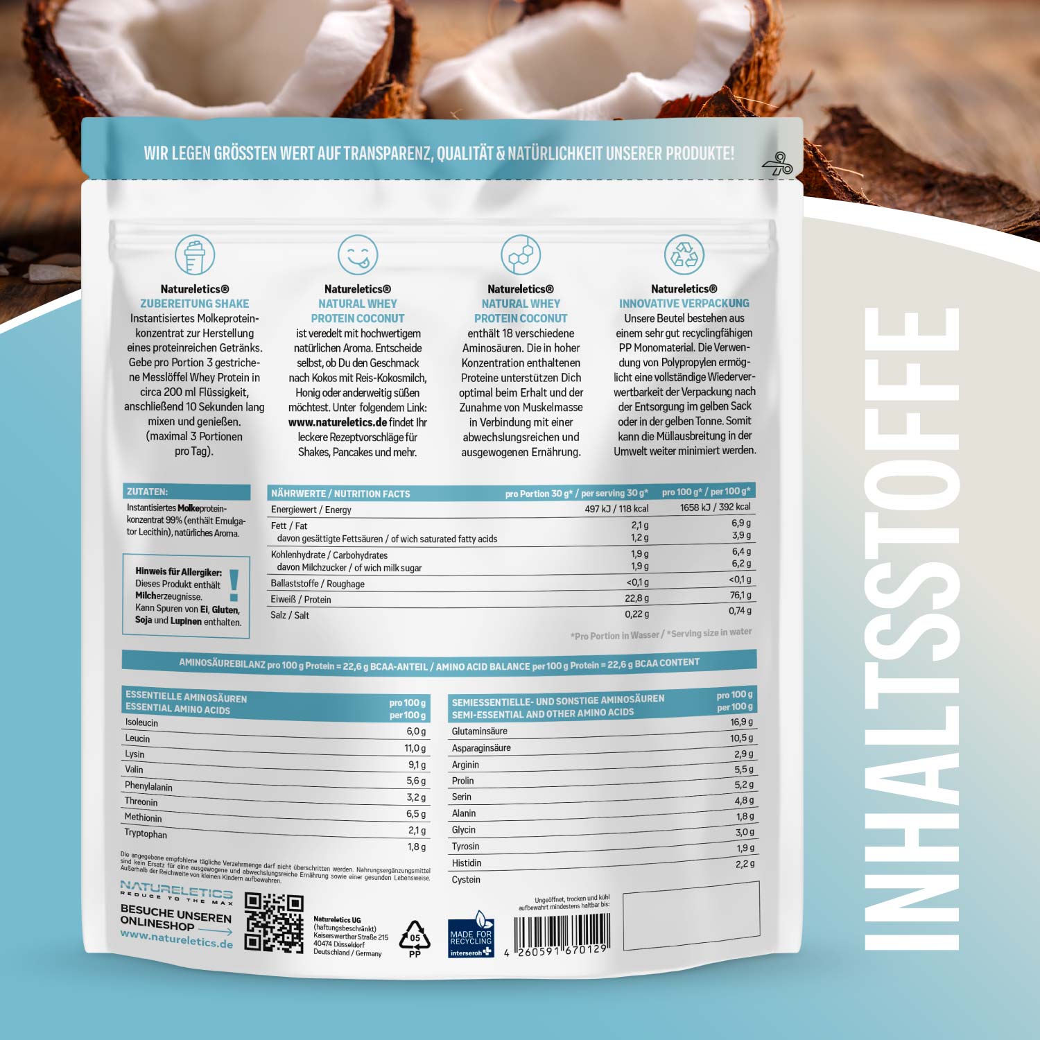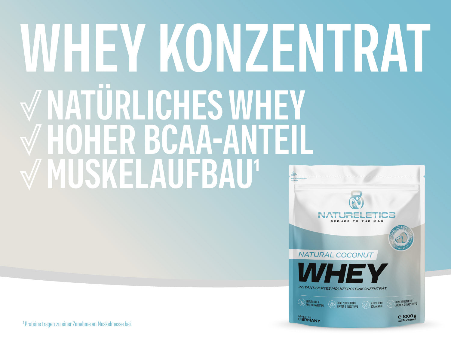 Unser NATURLETICS Natural Kokos Whey Konzentrat unterstützt Dich optimal dabei, Deine Fitnessziele zu erreichen - egal, ob du Muskeln aufbauen, abnehmen oder Dich einfach nur gesund fühlen möchtest.