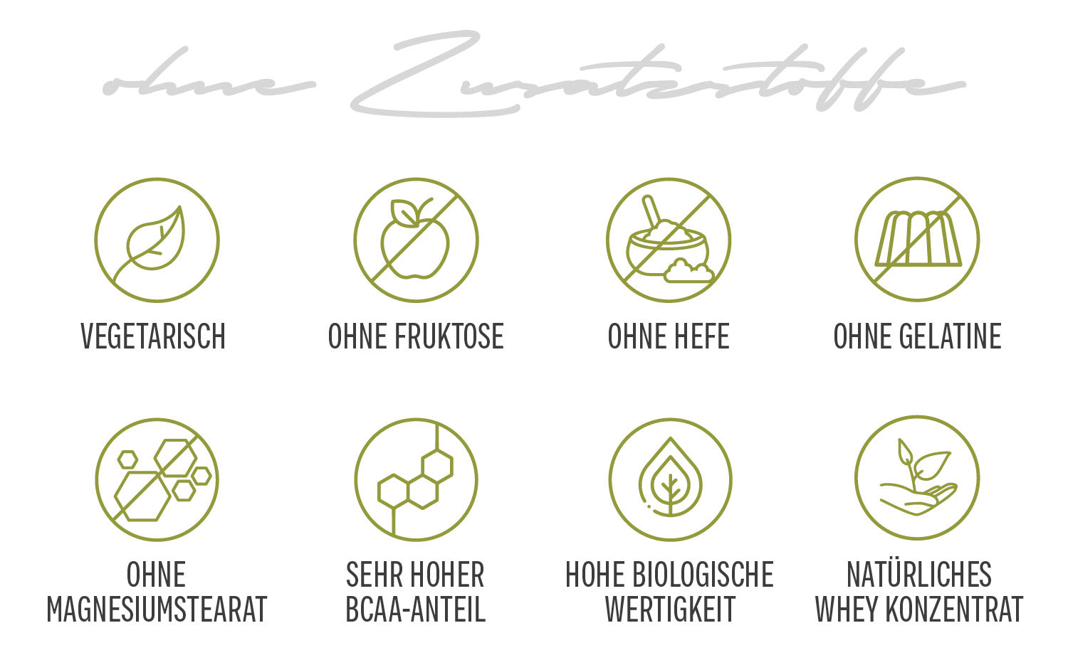 Wir finden weniger ist mehr und wir sind davon überzeugt, dass die Gesundheit deines Körpers die Voraussetzung dafür ist, auf natürlichem Weg langfristig qualitative Muskelmasse aufzubauen. Wir verzichten deshalb auf jeglichen Zusatz von Zucker, Süßstoffen, künstlichen Aromen und Geschmacksverstärker. Manchmal ist weniger einfach mehr.