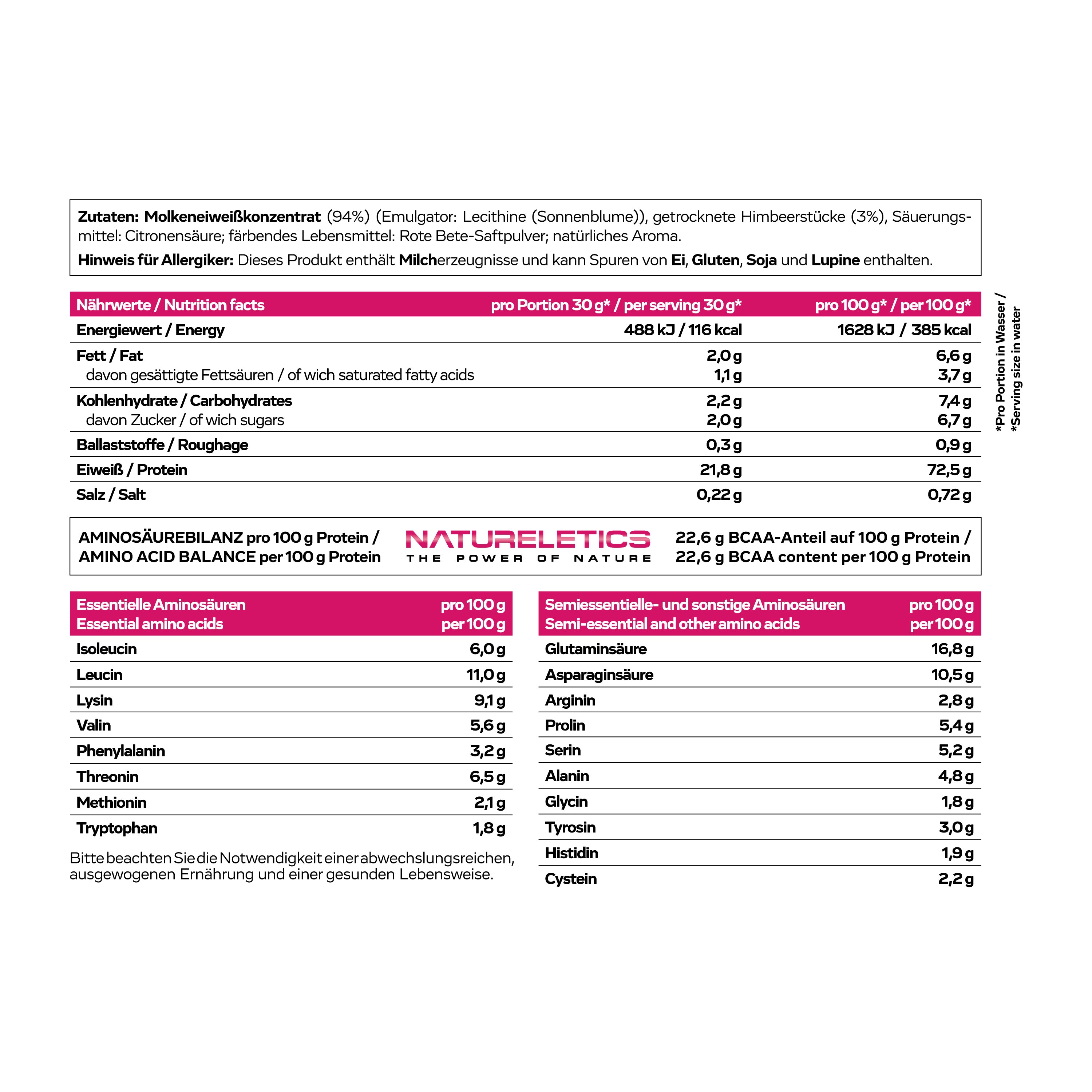 Insgesamt enthält unser Pure Natural Raspberry Whey 18 hochwertige Aminosäuren. Mit einem hohen BCAA-Anteil von über 22 % unterstützt es dich optimal beim Training, Muskelaufbau und der Regeneration. So versorgst du deine Muskeln gezielt mit hochwertigem Eiweiß für mehr Kraft, Definition und Fitness.